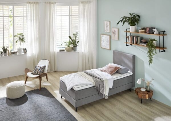 De 20 cm dikke matras is voorzien van 380 veren/m2 en 7 ergonomische zones, dus ook inclusief de comfortabele heup en schoudercomfort zones. Geheel in kleur van de boxspring dus keurig afgewerkt.